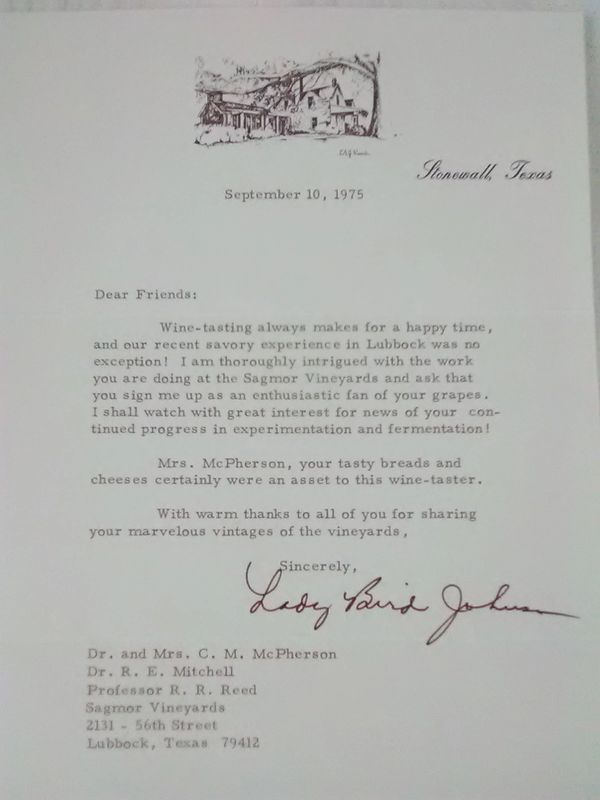 Lady Bird Johnson in the vineyard's barn being served SAGMOR wines by Doc's wife Clara. This was a last-minute opportunity brought about while the former First Lady was in Lubbock touting her Texas wildflower initiatve. (That's one of her secret service guys behind her.)